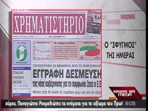 "Σήμερα αναμένεται ο Γιώργος Παπανδρέου και ο Αντώνης Σαμαράς να κάνουν το τελικό «βήμα» στη συμφωνία τους, ώστε η χώρα να αποκτήσει κυβέρνηση και νέο πρωθυπουργό. Τα θετικά μηνύματα εστάλησαν χθες το βράδυ με την ανακοίνωση του κυβερνητικού εκπροσώπου και την είδηση ότι σήμερα στις 12 το μεσημέρι θα συνεδριάσει το Υπουργικό Συμβούλιο".